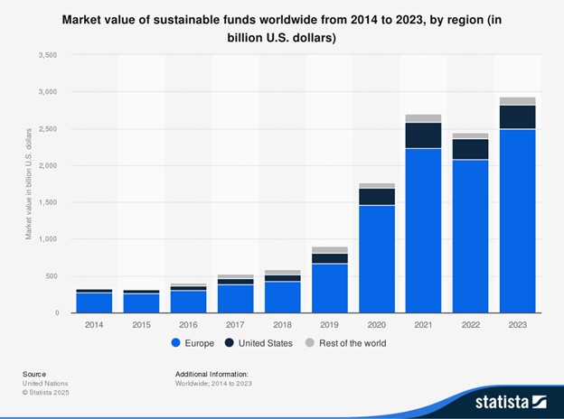 The past decade has witnessed a significant surge in susbtainable funds worldwide. Figure 1 shows that the global market value of sustainable funds increased from USD 326 billion to nearly USD 3 trillion, between 2014 and 2023, with Europe leading in ESG-aligned assets. Figure 2 shows that there has been a significant expansion of global sustainable funds in recent years in terms of the total assets under management of various fund houses. After rising consistently between 2018 and 2021 and reaching their highest point by the end of 2021, they experienced a temporary decline to about USD 2.8 trillion in mid-2022. However, this decline was short-lived, as sustainable fund AUM rebounded, climbing to approximately USD 3.56 trillion by December 2024.